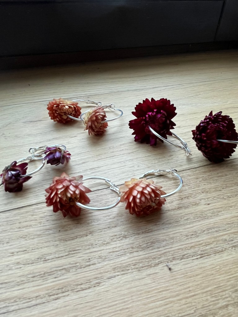 Trabajo con flores frescas, secas y prensadas. La colección varía en función de la temporada. Puedes contactarme por whatsapp (678631156) para hacer tus encargos o concertar una visita a nuestro taller. También me encontrarás en el mercado de Potes de los lunes y en algunas ferias de artesanía que publico en mi perfil de instagram @rosebud_artefloralsostenible