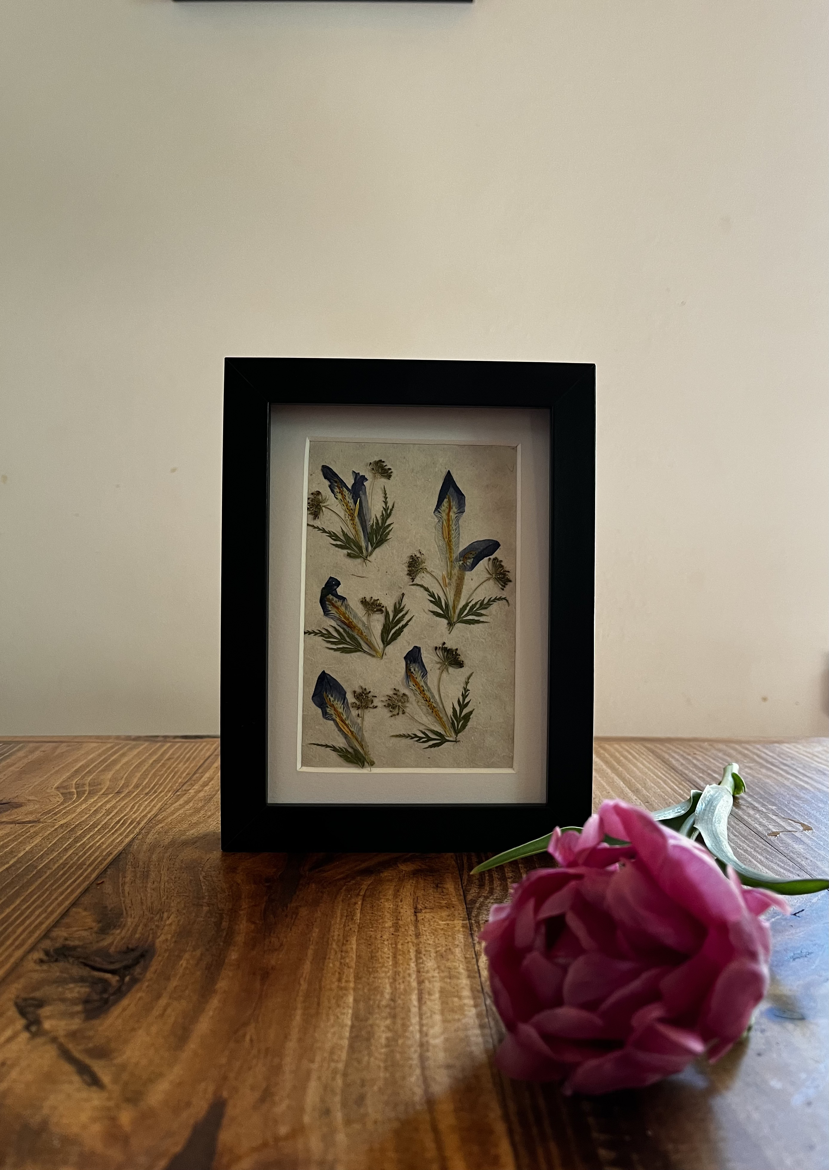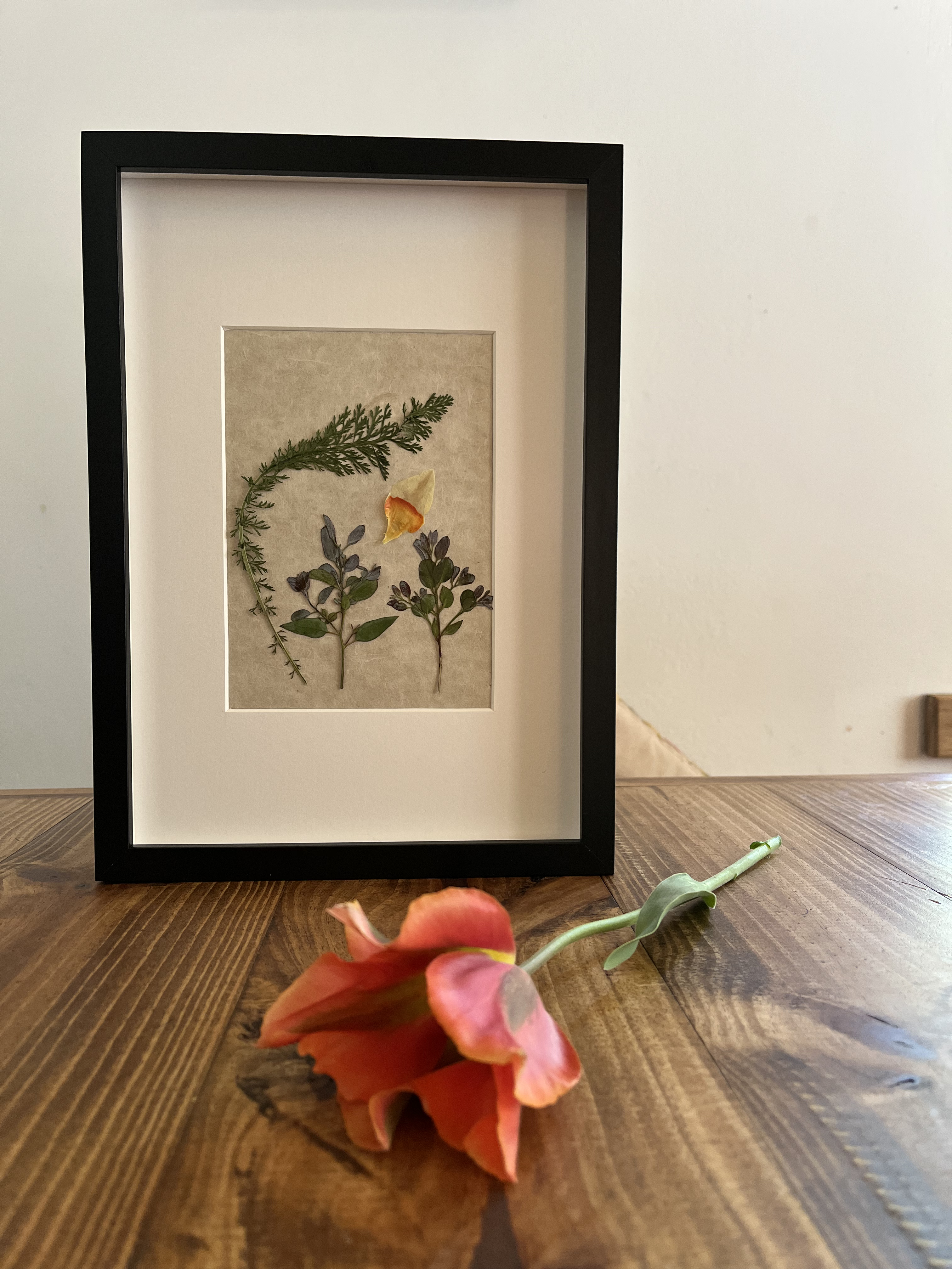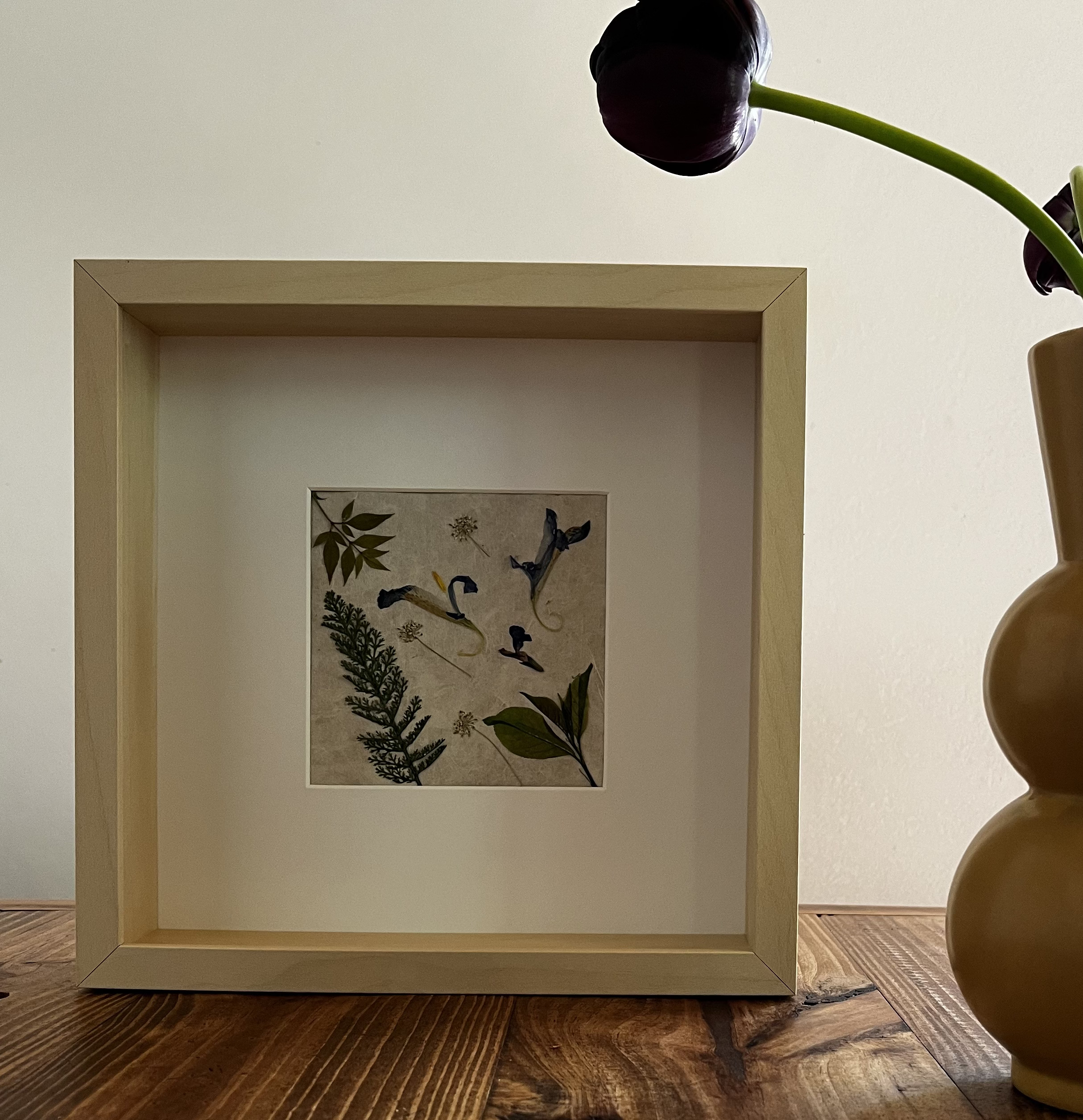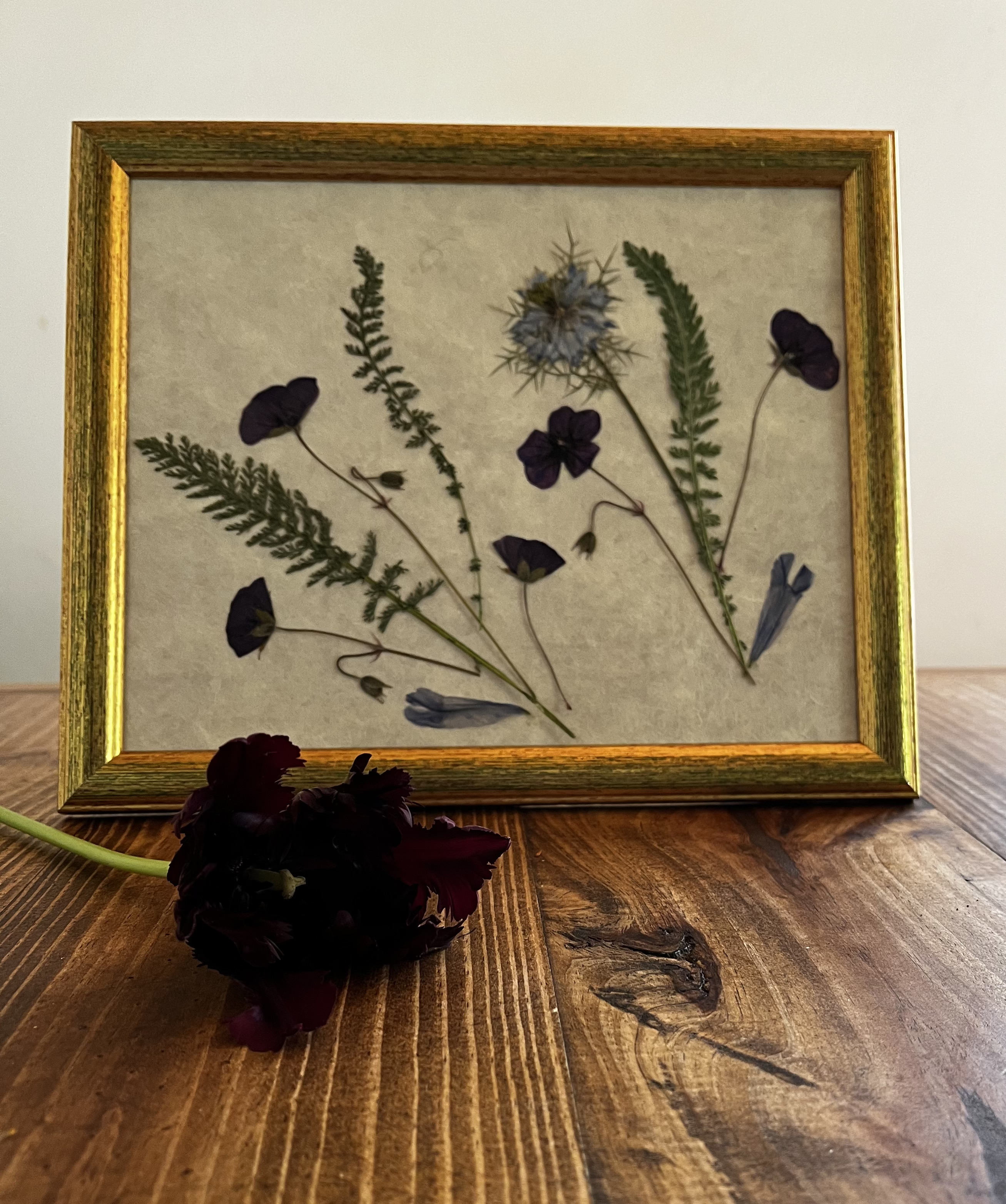 Prensar flores y trabajar con ellas no estaba en mi plan inicial. Llegué a esta técnica por la observación de mis primeros tulipanes. Un pétalo que cae sobre la mesa de madera y la luz del sol que entra por la ventana se proyecta sobre él… ¿Cómo sería poder ver estos pétalos al trasluz? Entonces empecé a adentrarme en el mundo de los papeles naturales, de los papeles orientales. De ahí a investigar con distintos pegamentos, marcos y acabados, hasta que poco a poco fui encontrando mi propio estilo.